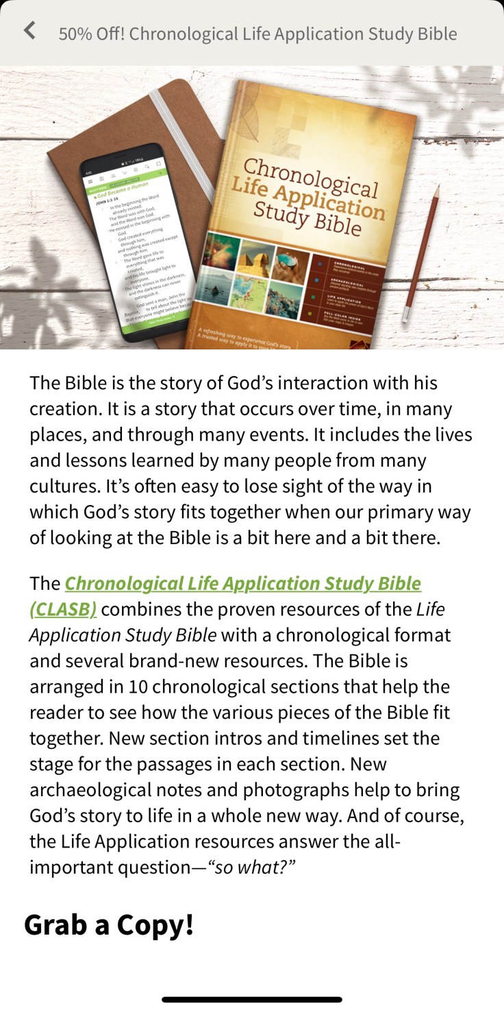 50% Off! Chronological Life Application Study Bible.