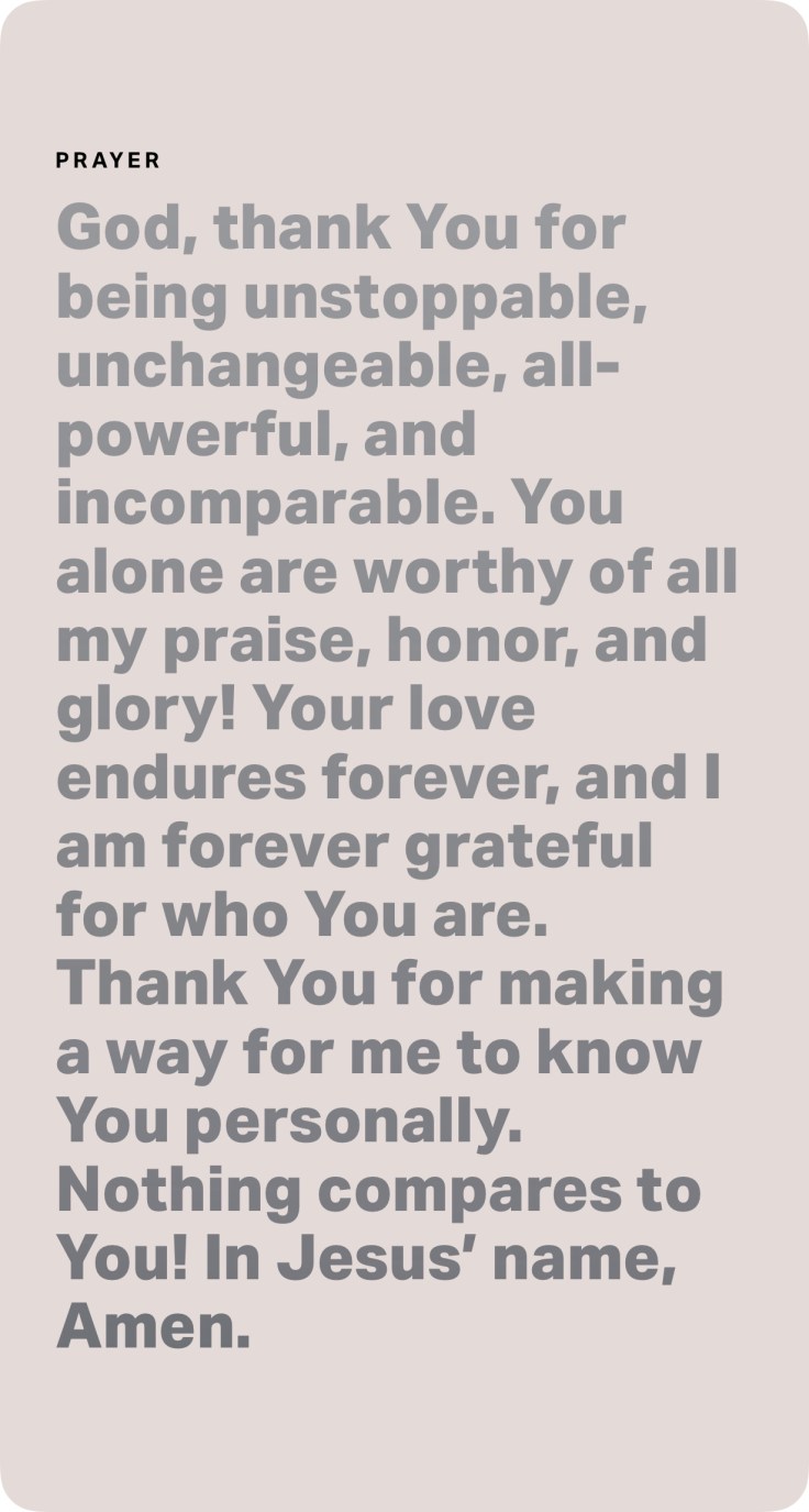 Right now, reflect on your life and thank God for His eternal goodness. Nothing you have faced or will face is too much for the God who loves you and died for you. Bring Him your concerns, surrender your expectations, and allow Him to reveal the evidence of His goodness in your life.